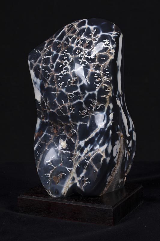 Beau bloc d’agathe polie. Cette exceptionnelle agathe bleue nuit ponctuée de nuages blancs provient de Madagascar, elle laisse apparaître de très beaux motifs hiéroglyphiques à sa surface. Très recherchée des collectionneurs. Sa forme évoque un buste féminin. Socle en bois exotique (Padouk d’Afrique).