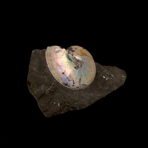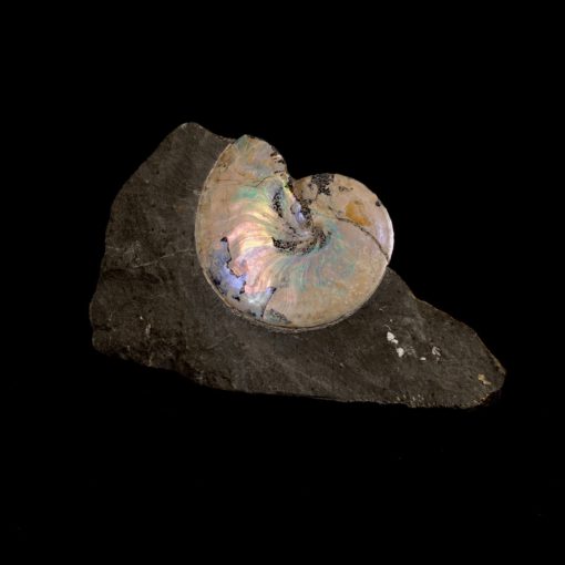 Somptueuses couleurs et splendide chatoiement pour cette ammonite fossile. La nacre offre des reflets irisés subtilement teintés de rose, fuschia, violet, jaune et bleu pastels. Dans sa gangue originelle. (Ammonite Spenodiscus lenticularis – USA).