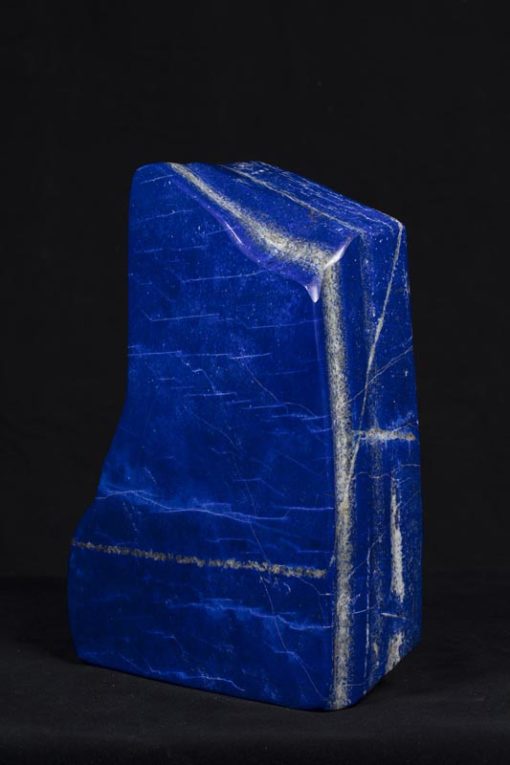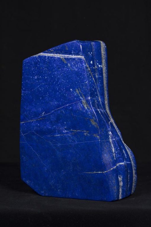 Très beau bloc de Lapis-lazuli poli (Badakshan – Afghanistan). Ce spécimen est du meilleur bleu, le plus recherché. Il est juste réhaussé de quelques lignes de pyrite. Une véritable sculpture ! Très belles dimensions : 30 x 20 x 10 cm. Poids 12 Kg.